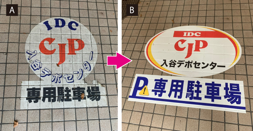 駐車場に貼ってある古く汚れたシートの張り替えです、プリント工房ではAsphalt WALKというメディアシートを使って、そのシートをリニューアルしました。